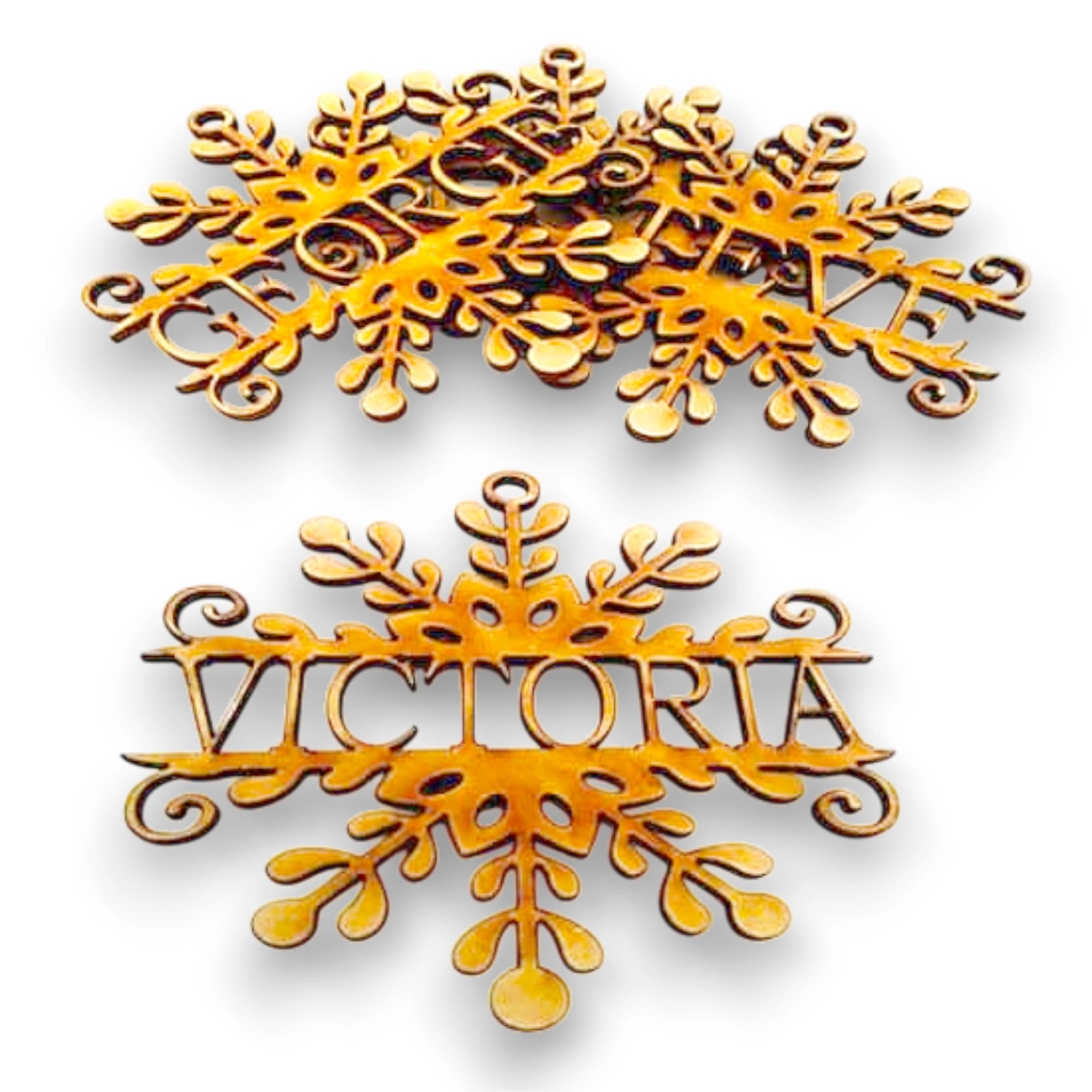 The ideal name length to use for these perfect Christmas decorations is up to 7 letters long, any longer than this, and the letters get a little too close for comfort, but we will try to make them fit for you. If you can shorten long names with nicknames? then your decorative tree baubles will look a lot better.